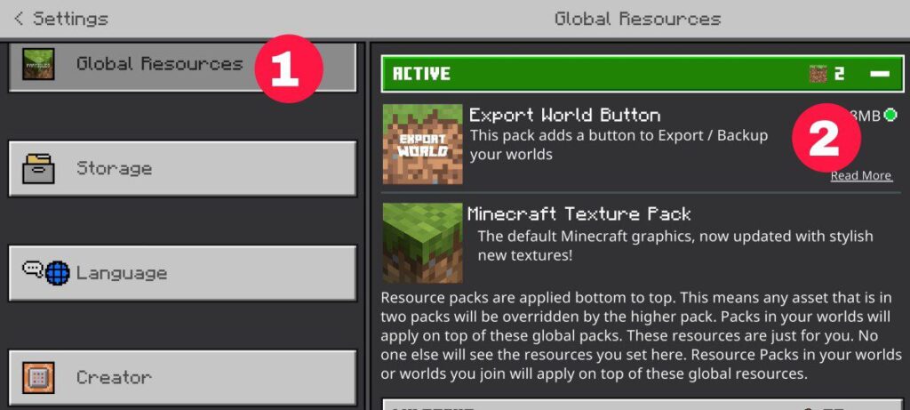 - Pack not activated globally: Some players forget to enable the Export World Button pack in Global Resources. If it’s not active, the button won’t appear in the world settings.